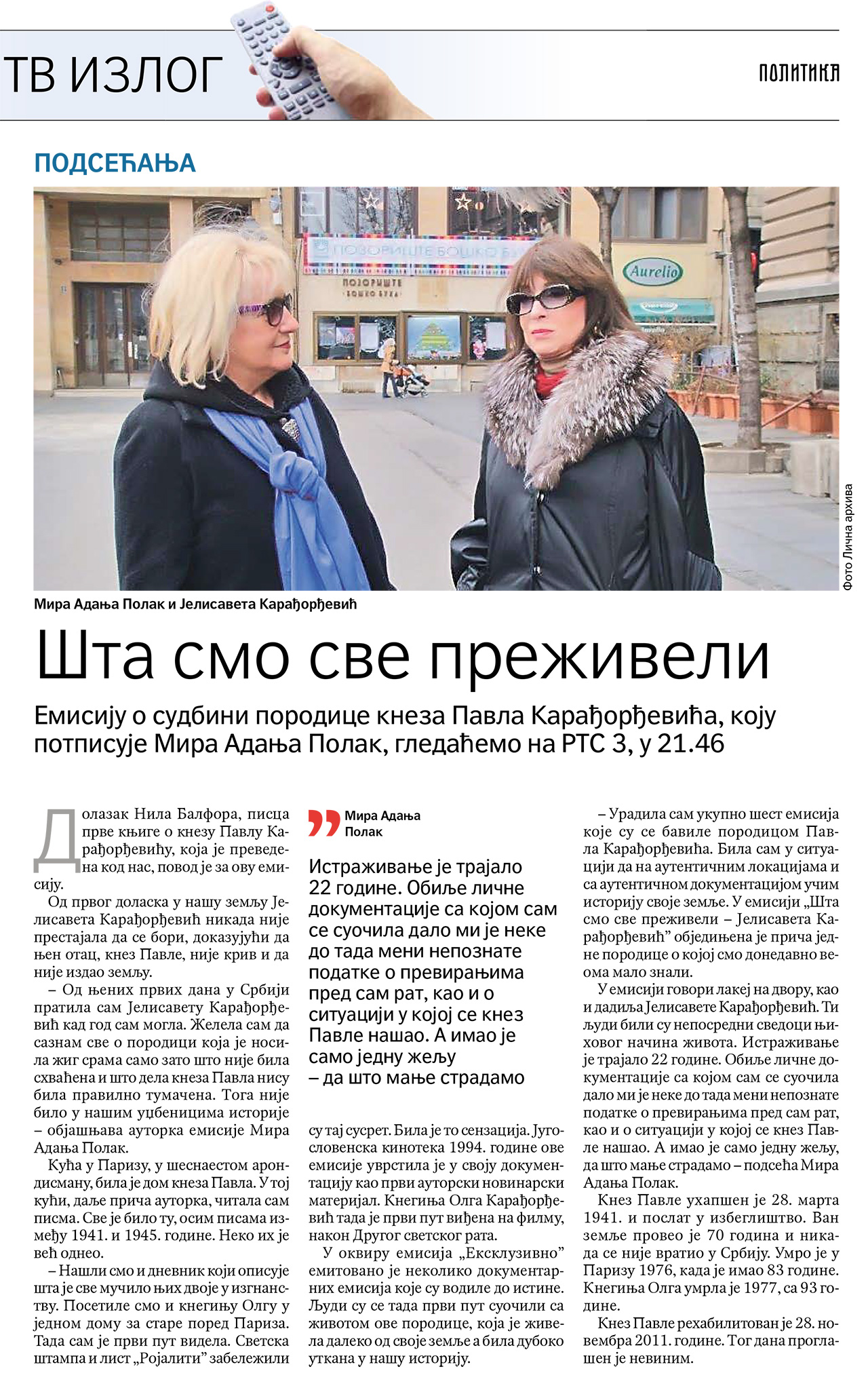 Dolazak Nila Balfora, pisca prve knjige o knezu Pavlu Karađorđeviću, koja je prevedena kod nas, povod je za ovu emisiju. Od prvog dolaska u našu zemlju Jelisaveta Karađorđević nikada nije …